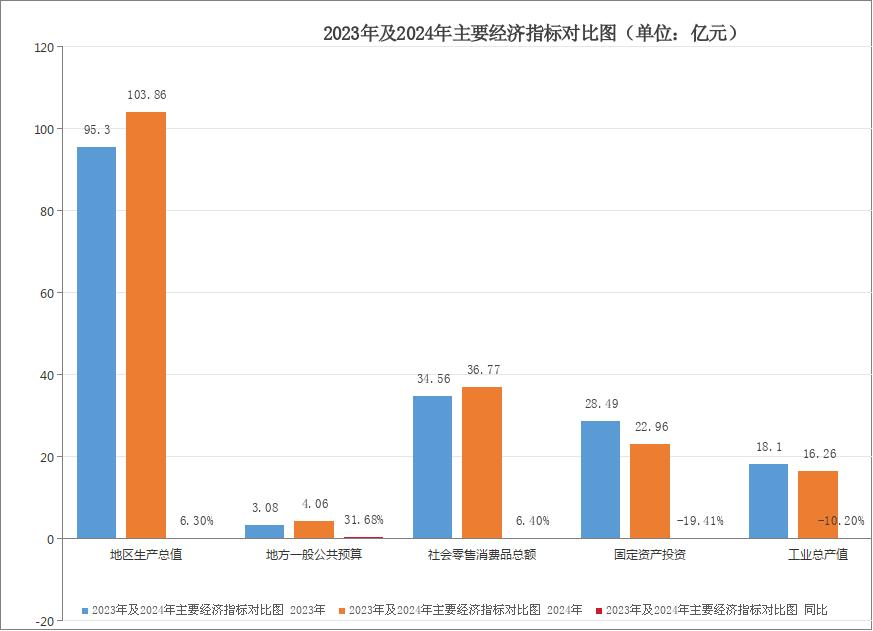 (一)地区生产总值。2024年地区生产总值目标任务为102.93亿元,增速为8%;2024年地区生产总值完成103.86亿元,同比增长6.3%,总量位居11县(区)第一名,占全市生产总值的27%,但增速较目标任务低1.7个百分点,仅排全市11县(区)第8名。